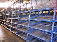 Pallet Flow o Dinámicas: Las estanterías Pallet Flow o paletización dinámica por gravedad es el sistema perfecto para aquellas necesidades de controlar el inventario mediante un sistema FIFO (primera en entrar, primera en salir). Las paletas son colocadas en un túnel que incorpora caminos de rodillos con una ligera pendiente que permite el deslizamiento de las paletas.En este sistema que se obtiene la ventaja de un sistema dinámico y el ahorro de espacio de un sistema Drive In, logrando obtener tanto selectividad y densidad de almacenamiento.