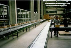 Los Transportadores de gravedad por ruedas se fabrican en modelos de acero galvanizado y están conformados por una serie de ruedas colocadas en un eje común, que se soporta en una canal estructural. Estos pueden instalarse en líneas provisionales o permanentes, usando secciones rectas de 5 y 10 pies de largo y de anchos de 12, 18 y 24 pulgadas. Estos transportadores se utilizan para transportar paquetes con superficie uniforme y de poco peso, o para aquellas operaciones que requieran secciones livianas de manejo manual, tales como cartones, estuches, cajas livianas de madera o metal. Este equipo se fabrica en varias combinaciones de ruedas con las siguientes características: |